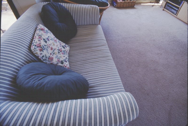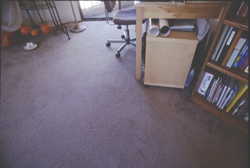 That gave me 95% of the results I wanted. Although the stitching was fairly accurate, it was not exactly perfect and some things inevitably didn't quite match up along the seams between two neighboring images. It took me a couple of hours of fussing with Gimp to straighten these out to my satisfaction. (The results still aren't perfect; you can see some of the artifacts if you look closely enough.) Some of these problems are due to imperfections in the wide-angle lens I used to take the pictures (this particular lens seems to distort things a bit too much on the edges of the frame, and things on the edges are significantly too dark), and some due to the fact that even on the tripod, the camera didn't exactly rotate around the nodal point of the lens, so there's a bit of unwanted parallax between different images--especially on things near to the camera like the couch in the foreground and the bookshelf behind the camera.